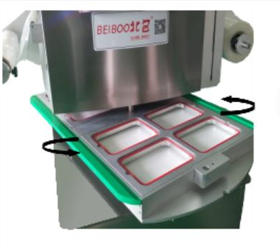 机械特点:该机设想新鲜,可密封PP,产量高,一个轮回可同时密封多个托盘,